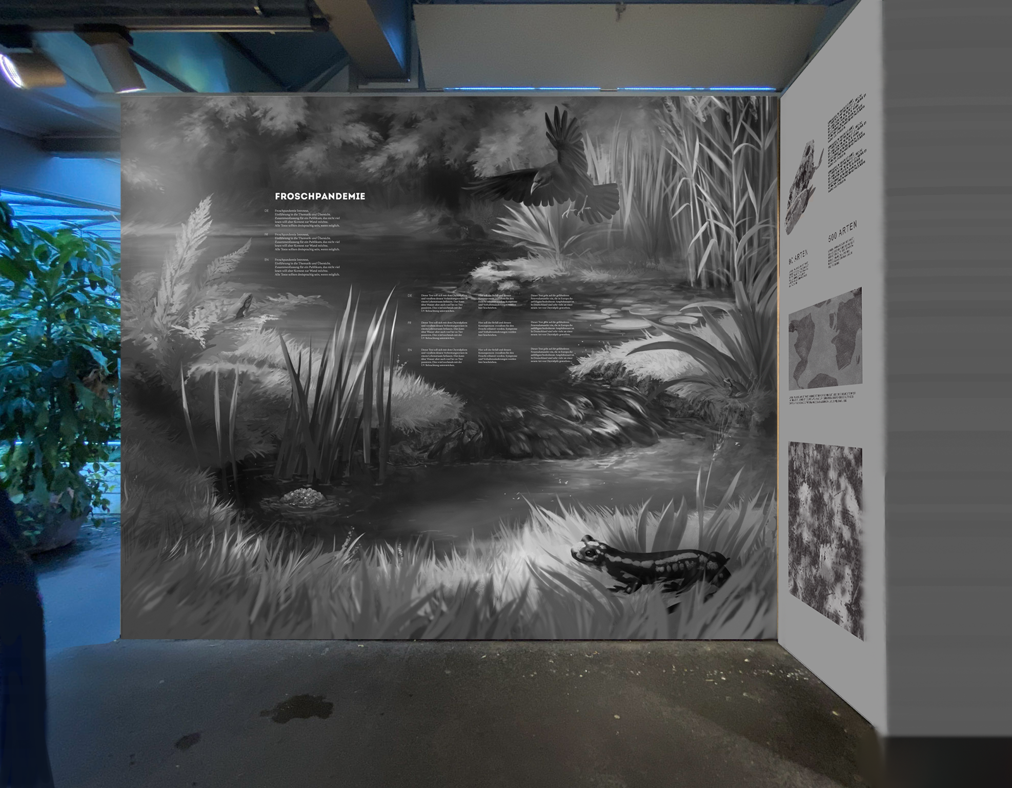 This is a concept for the renovation of the exotarium in the Zurich Zoo, done in cooperation with the Zoo’s department of education in 2020. It explains the spread and impact of the Chytridfungus, which is currently one of the biggest threats to amphibians. Some species have become endangered, while others have gone extinct due to wide-spread infection of the fungi. Unfortunately this is a global issue and can therefore be found in local swiss amphibians as well.
